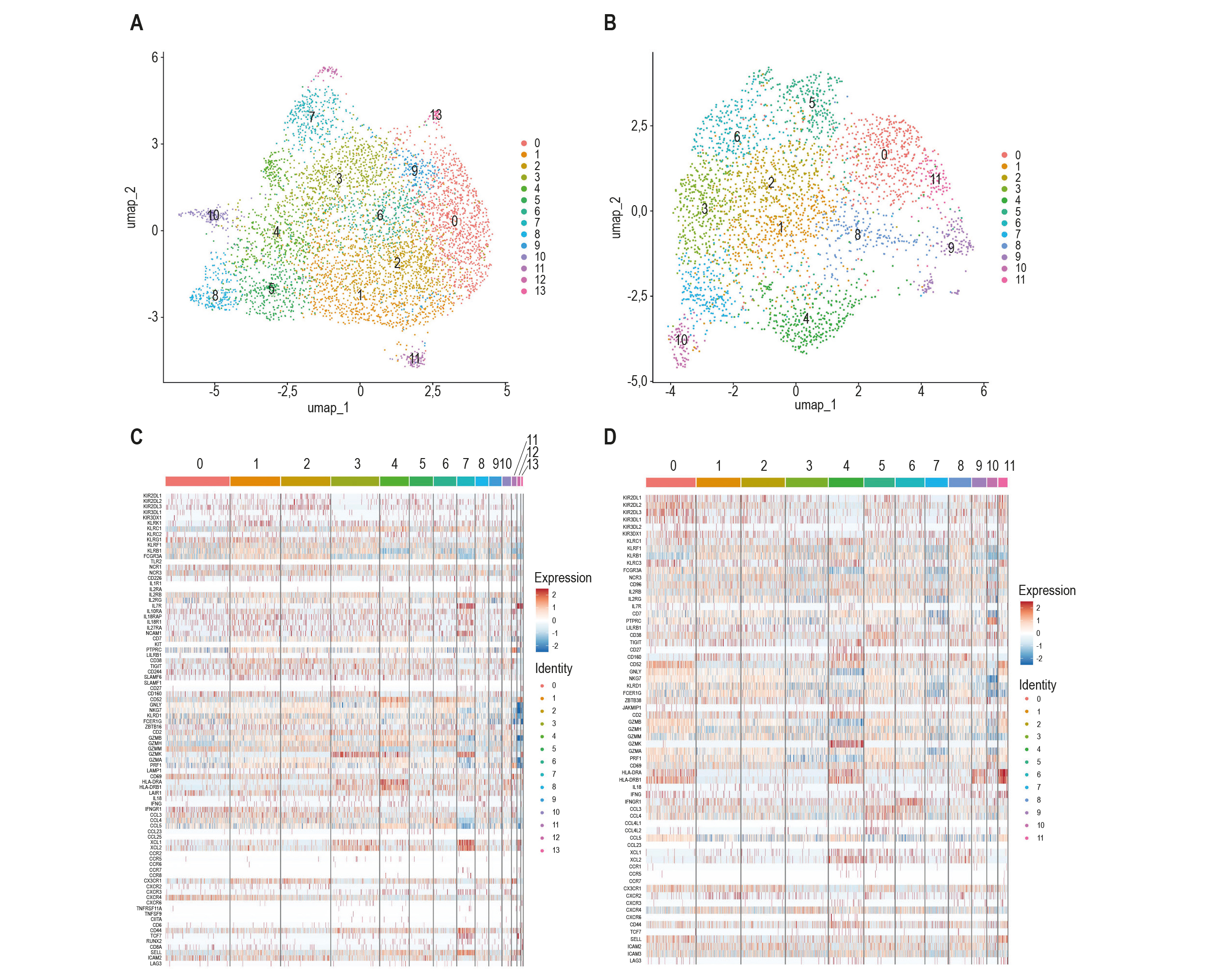 Note. UMAP projections showing NK cell clusters for (A) patient1 and (B) patient 2. Heatmaps display normalized expression values of NK cell-associated genes differentially expressed in at least one cluster for (C) patient 1 and (D) patient 2.