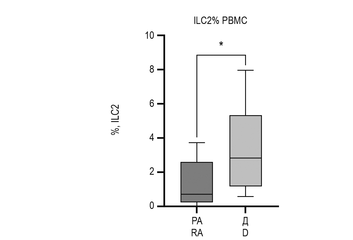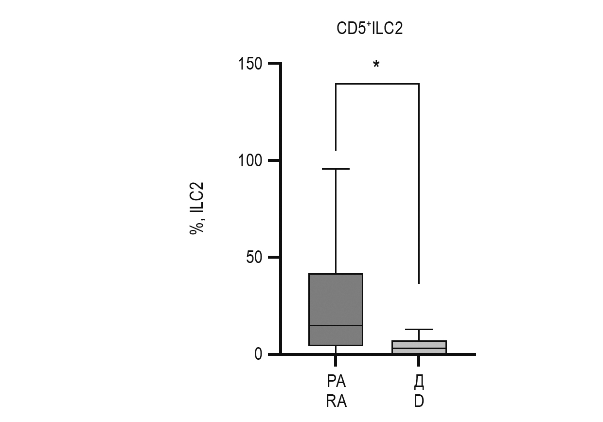 Таким образом, увеличение CD5+ILC2 среди ILC2 и снижение ILC2 среди МНК ПК может свидетельствовать о возможном участии этих клеток в патогенезе ревматоидного артрита.