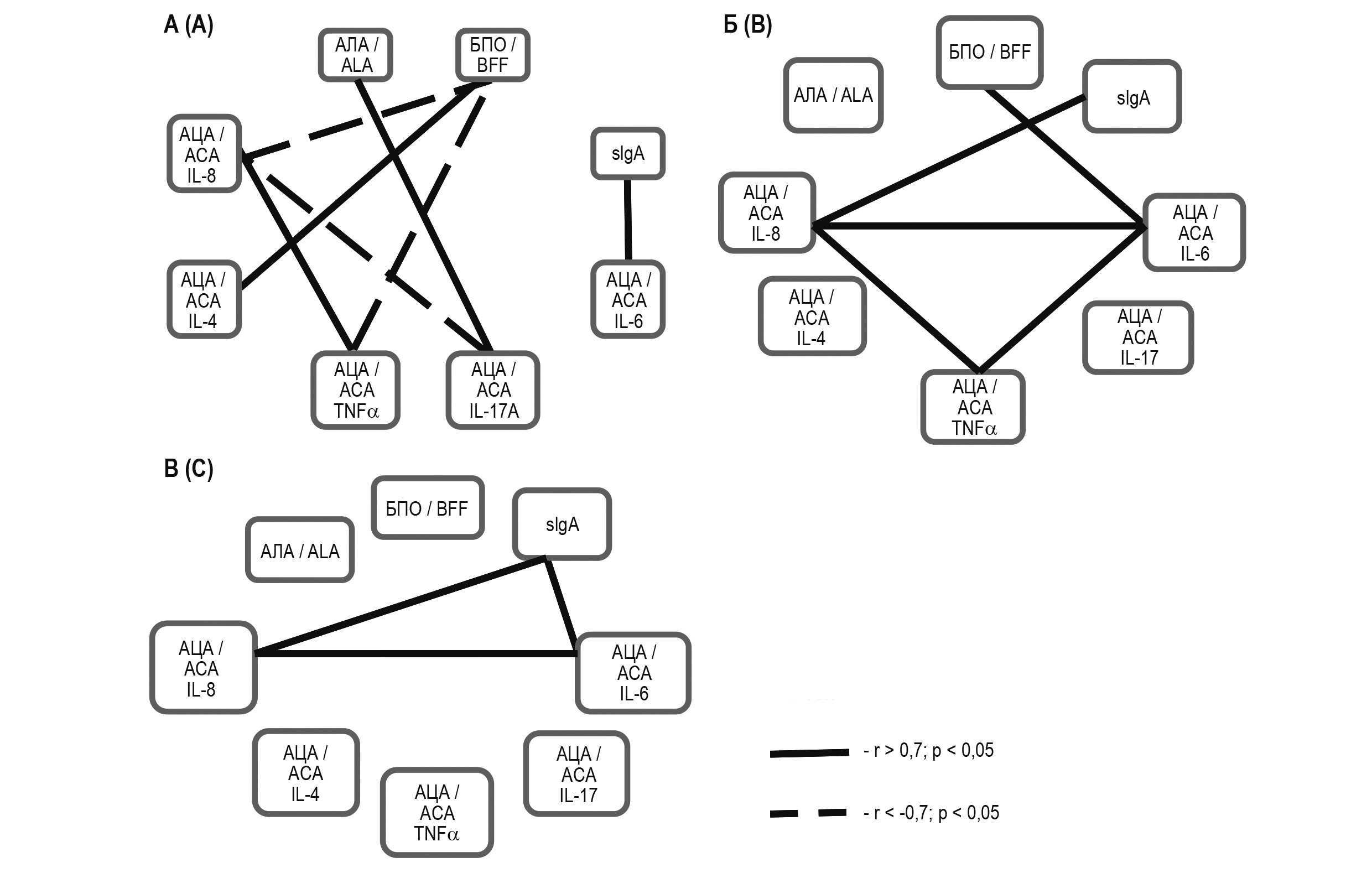 Так, у штаммов S. aureus экспрессия АЦА в отношении IL-8 положительно коррелировала с sIgA-протеазной активностью, АЦА IL-6, АЦА TNFα (r = 0,94, r = 0,7 и r = 0,76 соответственно; p < 0,05). Установлена высокая степень корреляционной зависимости между АЦА IL-6 и АЦА TNFα (r = 0,8; p < 0,05), а также АЦА IL-6 и БПО (r = 0,8; p < 0,05).