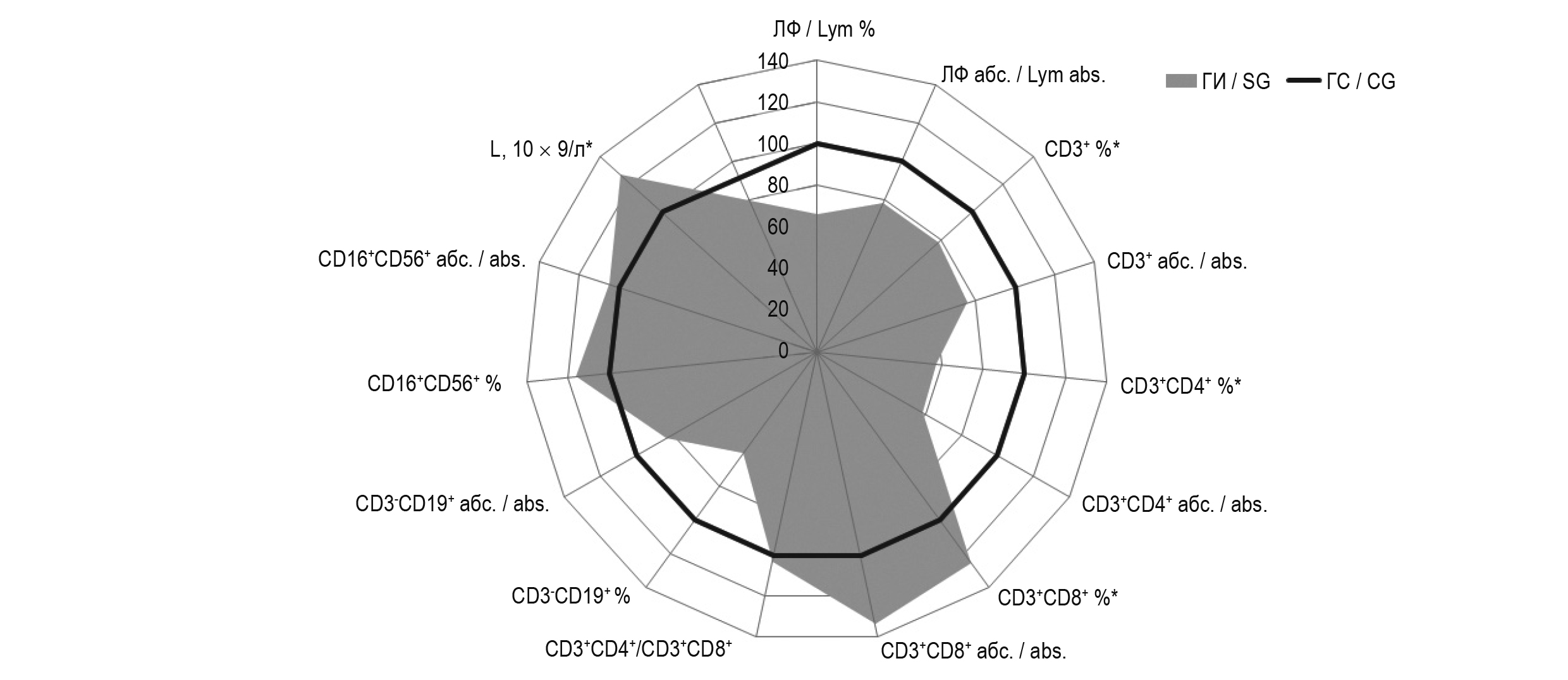 При исследовании иммунного статуса в ГИ пациентов с ХОБЛ отмечалось снижение в 1,3 раза относительного содержания Т-лимфоцитов (СD3+CD19-) 57,9 (55,35-61,05)% против 73,7 (66,3-77,4)% в ГС, (р = 0,0022) и в 1,7 раза Т-хелперов (СD3+СD4+) 27,8 (21,8-38,7) против 48,1 (36,3-49,6) в ГС, (р = 0,0361) и увеличение в 1,3 раза Т-цитотоксических лимфоцитов (СD3+СD8+) 37,8 (35,68-42,18) против 30,1 (26,0-34,3) показателей ГС, (р = 0,0349). Данные изменения могут свидетельствовать об инверсии ИРИ 1-го порядка у пациентов с ХОБЛ ИРИ – 1,34 (0,69- 2,20) (р = 1,00) и приводят к нарушению соотношения лимфоцитов с хелперной и цитотоксической активностью (рис. 1).