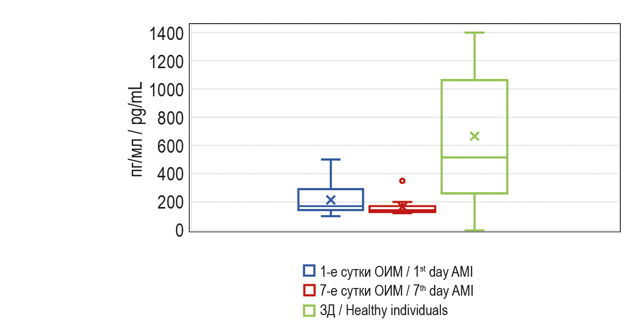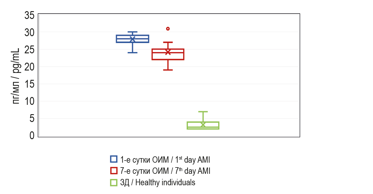 Рисунок 2. Сывороточный уровень IL-6 (пг/мл) у пациентов с острым инфарктом миокарда на 1-е и 7-е сутки госпитализации и здоровых лиц