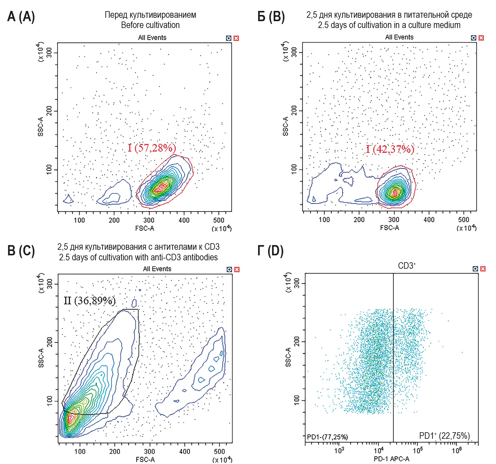 Рисунок 1. Репрезентативные диаграммы распределения лимфоцитов периферической крови крыс по параметрам прямого и бокового светорассеяния клеток перед культивированием (А), после 2,5-дневного инкубирования в питательной среде (Б) и после 2,5-дневного культивирования с иммобилизованными на дне лунок антителами к CD3 (В). Г – пример диаграммы для определения процента PD1+ клеток среди CD3+Т-лимфоцитов