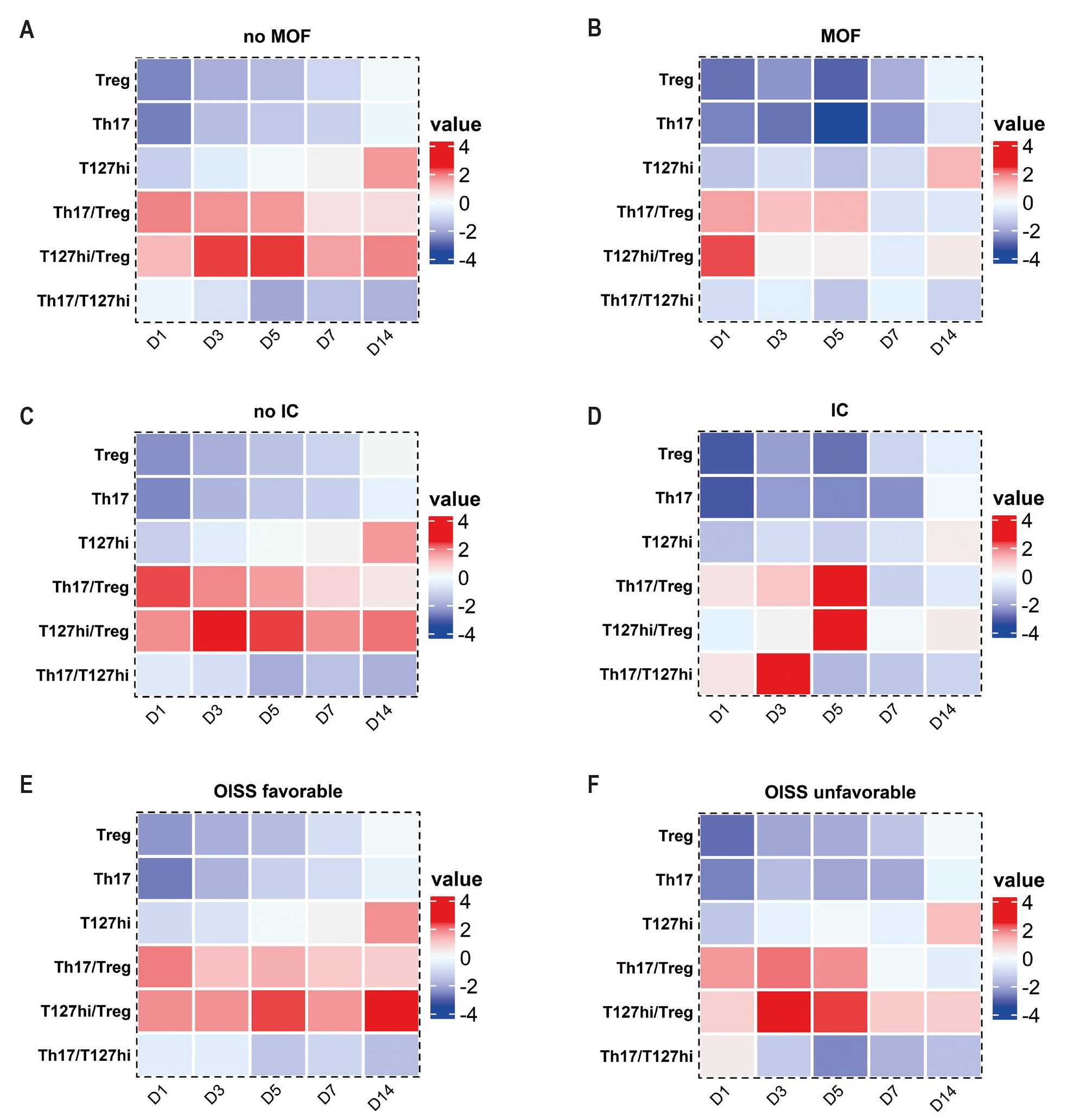 Figure 2. Heat maps show the kinetics of changes in perepheral blood T127hi, Treg, Th17 absolut cell count levels and Th17/Treg, T127hi/Treg, and Th17/T127hi ratio levels in the critical period of severe injury in children depending of MOF (A, B), infectious complication (C, D) development and outcome prediction of OISS (E, F)