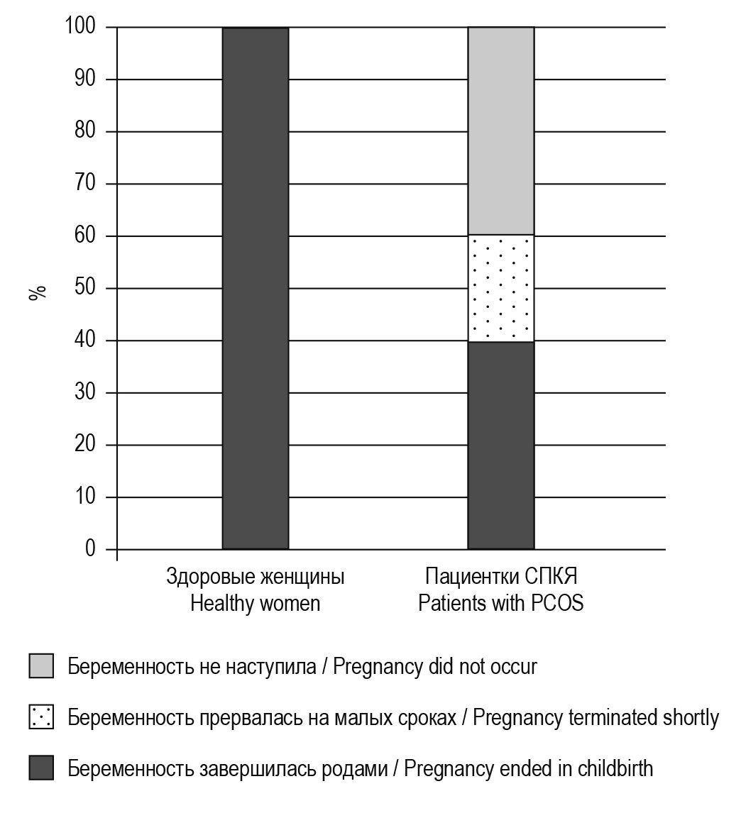 Рисунок 1. Данные по результатам ЭКО у здоровых женщин, принимавших участие в исследовании, и при синдроме поликистозных яичников